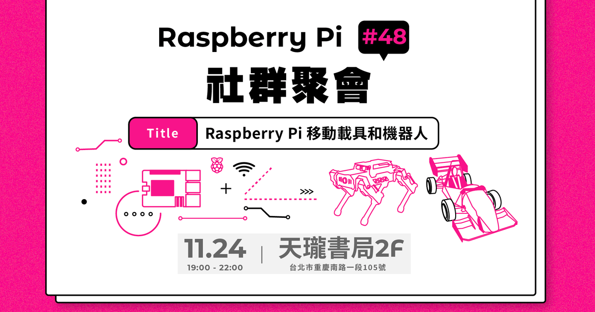 第四十八次 Raspberry Pi 社群聚會,希望能透過社群活動的分享和交流,找到更多 Raspberry Pi 的可能。本次主題是「Raspberry Pi 移動載具」。